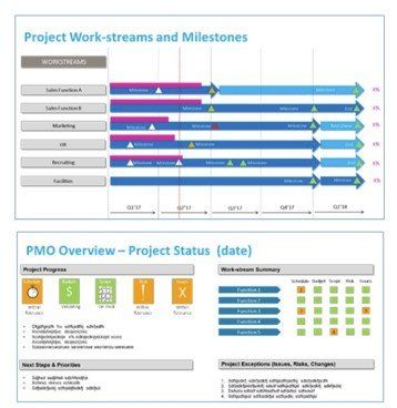 Project Dashboard: The heart of the effective PMO framework is a dashboard driven by an exception-based reporting approach, with progress tracked against an agreed plan of deliverables and completion dates linked to key project milestones. The dashboard forms a ‘bridge’ between the high-level view of the project work-streams and milestones created as part of the initial project creation process, and the detailed schedule. This high-level view was adapted to include progress updates from the detailed schedule and utilized by the Steering Committee for monitoring overall performance.